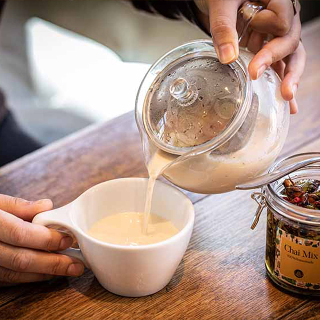 たっぷりの蜂蜜に数十種類のスパイスを漬けた自家製チャイを牛乳に混ぜて温めれば、ふんわり広がる甘くスパイシーな香り。