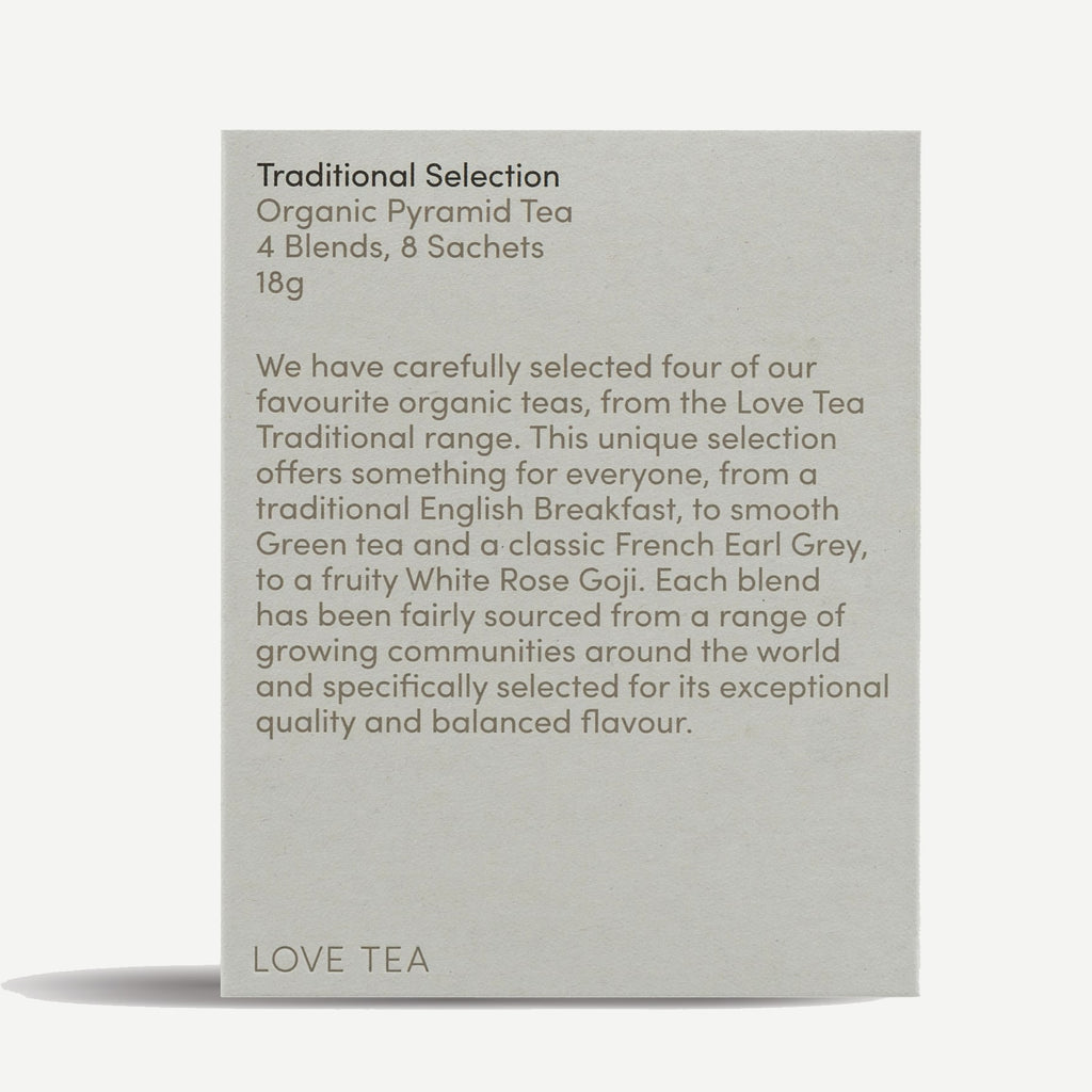 LOVE TEAを代表するブレンド4種を詰め合わせた、100%オーガニックのティーセレクション。ベストセラーの「フレンチアールグレイ」をはじめ、ナチュロパスのオリジナルレシピによる豊かな味わいを個包装でお届けします。お試しやご旅行、ギフトにも最適です。