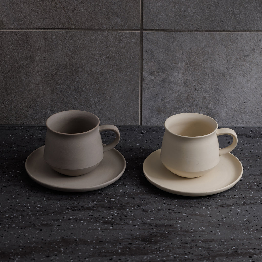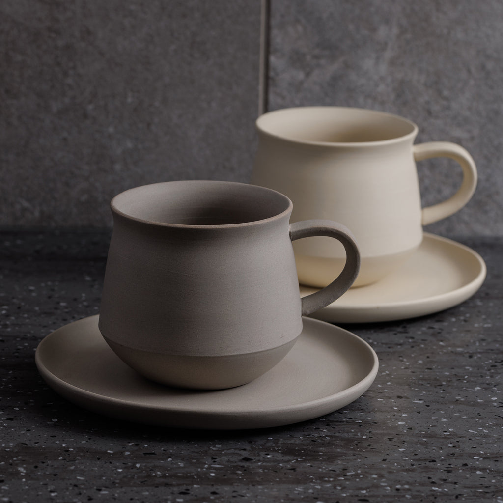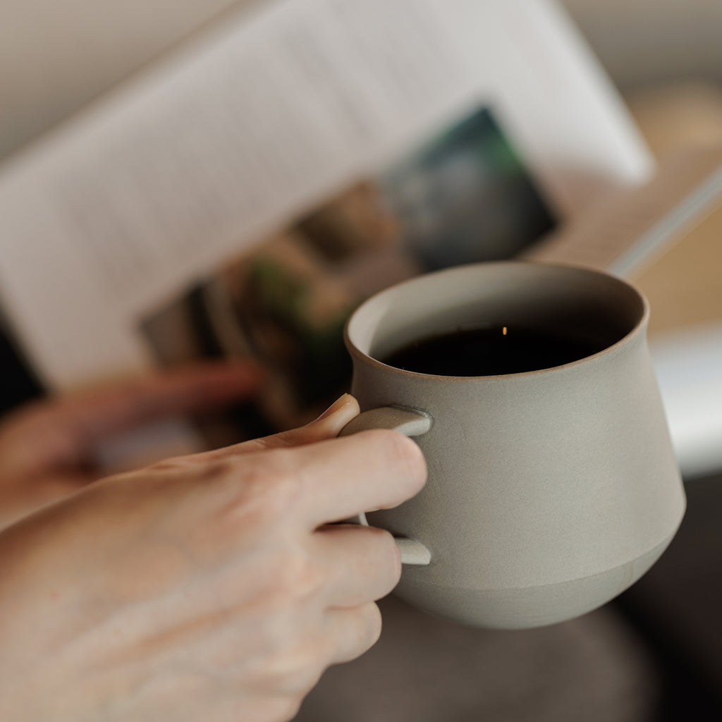 上部に向かってすぼまっていく独特な形は、コーヒーを口に入れたときにアロマがより鼻から感じやすくなる工夫が込められています。さらに口縁を薄く少し反らせることで、すっとコーヒーが口全体に広がり、複雑な甘みやフルーティーさをよりクリアに感じることができます。 また、常滑特有の素材「チャラ」をふわりと掛ける技法を採用し、ガラス質の釉薬と異なる控えめな光沢が滑らかな質感と温かみのある風合いに。どんなインテリアや食卓にも馴染むようにシンプルでありつつも、使う時間が楽しみになるようにデザインにもこだわりました。